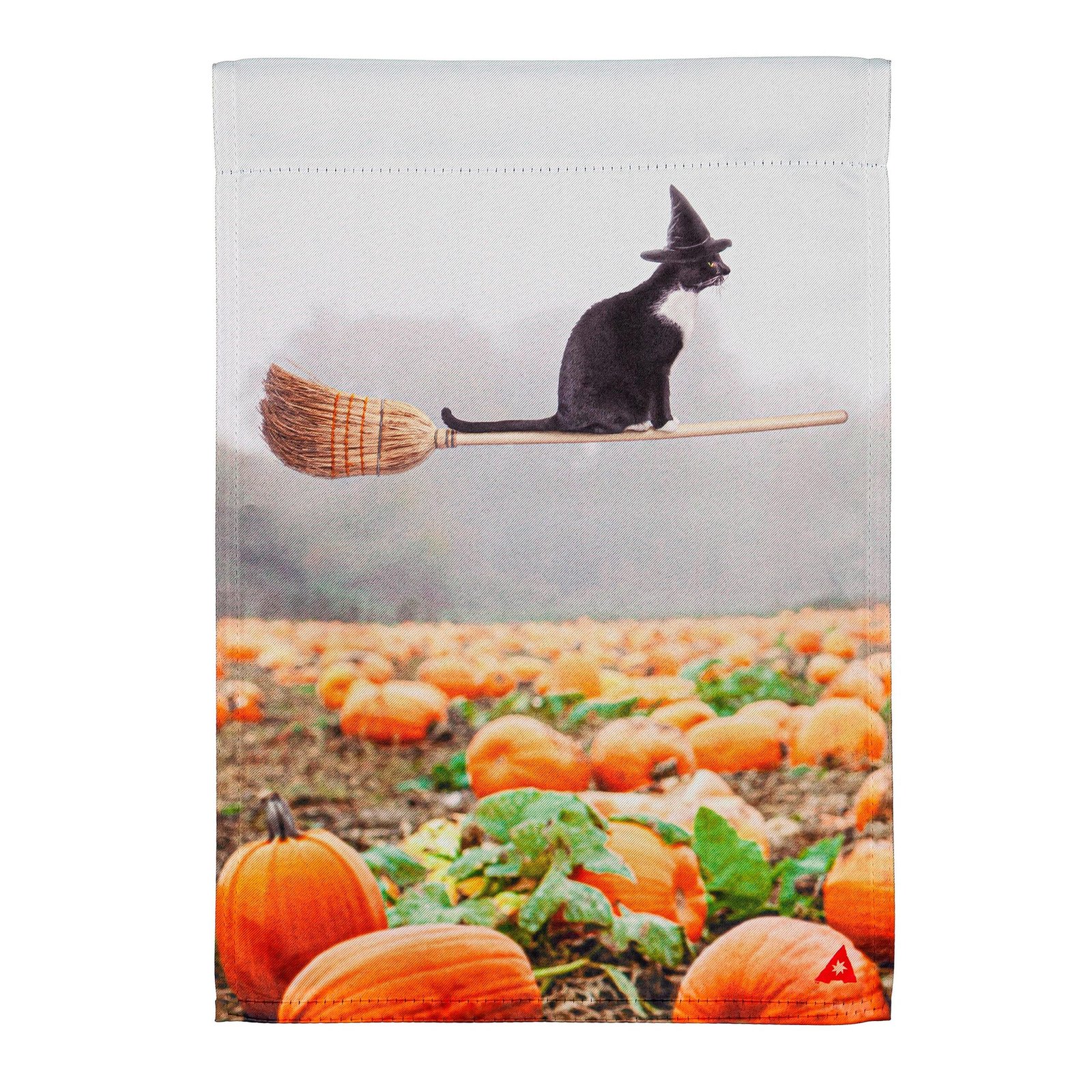 Fun garden flag with a cat flying over a pumpkin patch is a unique Halloween decoration.