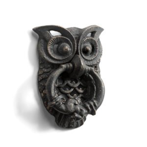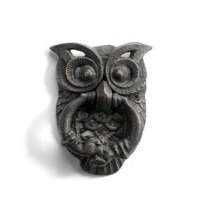 The Hooting Owl Doorknocker features a wise old owl that is sure to give a hearty welcome to all who see it. Extremely detailed, this cast iron owl is coated for outdoor use and fits almost all design styles.