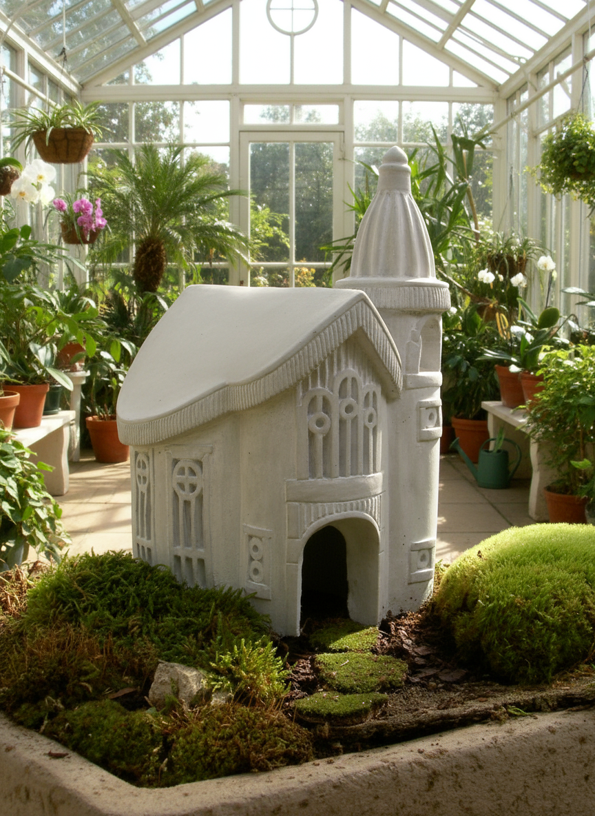 The Chapel Toad House makes a striking focal point in any landscape design. Tuck it under a shady hosta or hellebore planting, nestle it into the edge of a rock garden, or set it beside a small pond or water feature to enhance the storybook feel. It also looks right at home in a fern-filled woodland corner or paired with mosses and low-growing groundcovers like creeping thyme or ajuga. For an extra whimsical effect, surround it with miniature plants or fairy garden accents to create an enchanted chapel grove for your amphibious guests attending a toad wedding!